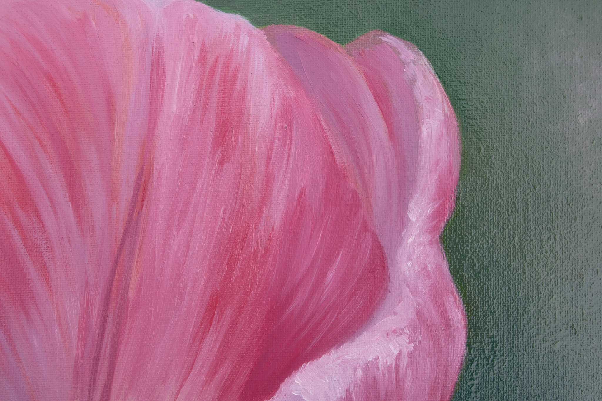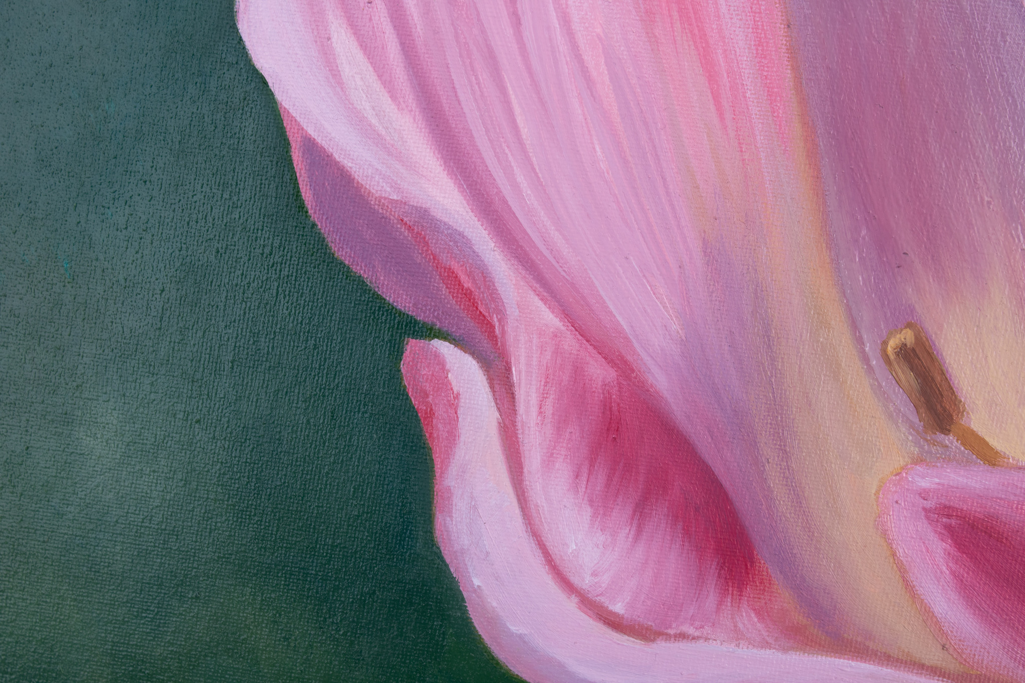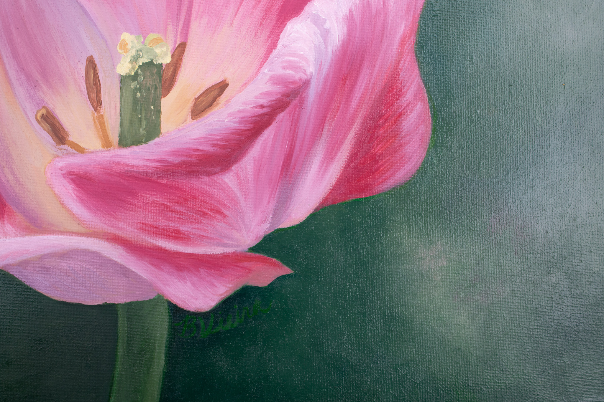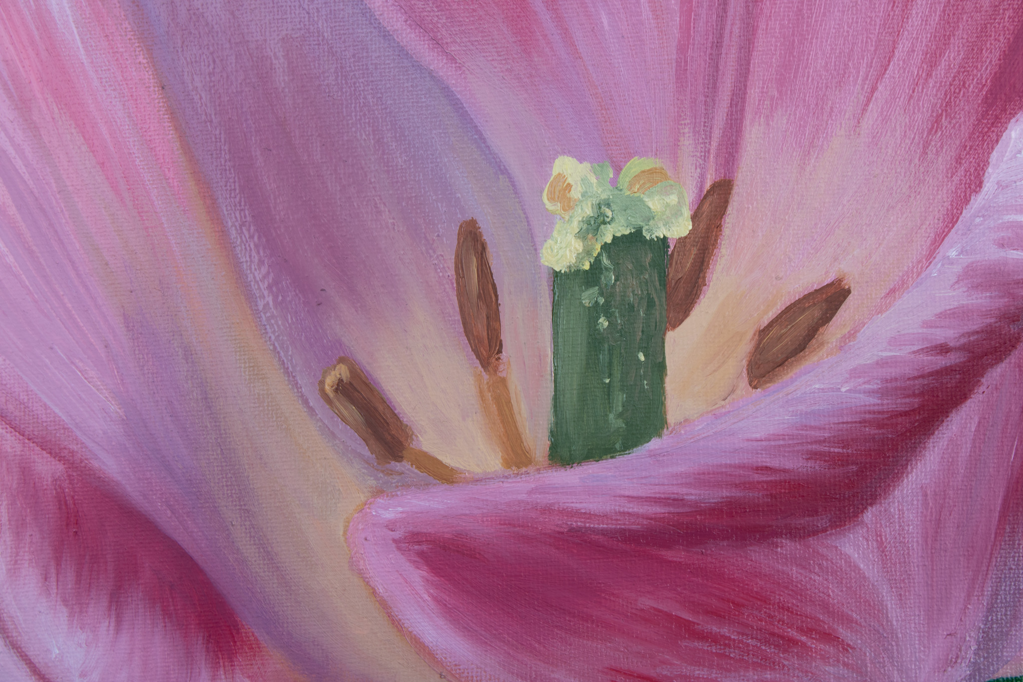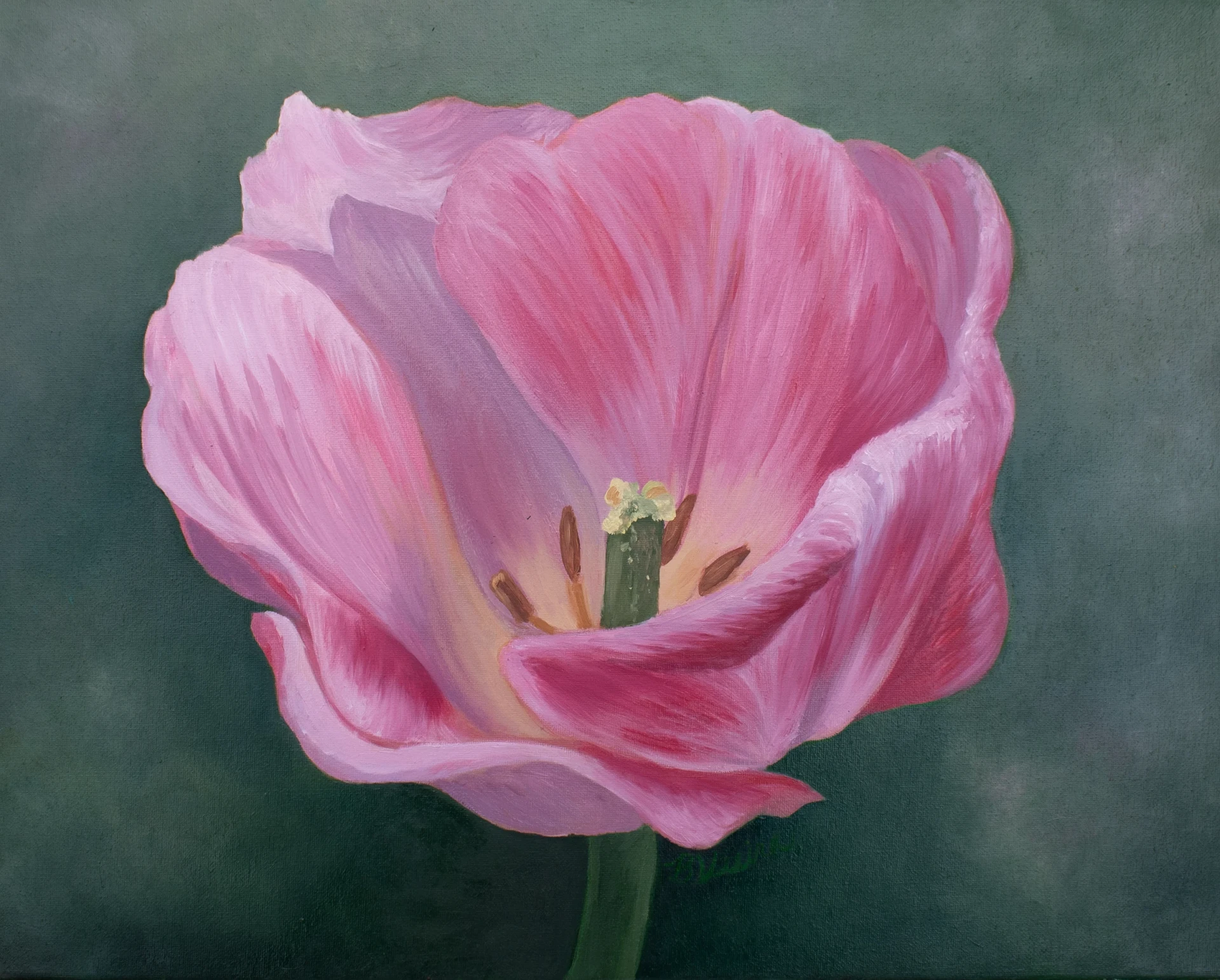 This is a painting of a tulip that is unfolding to reveal the inside of the flower. This flower is based on a photo I took of a beautiful tulip I saw. This was done with oil paint on 16x20 canvas.